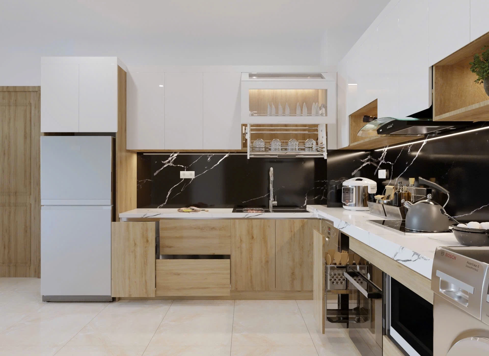 – Phần bề mặt tủ bếp được làm bằng các loại đá. Ngoài ra còn có kính ốp bếp